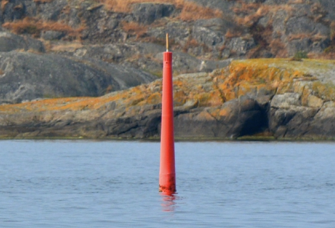 Fargene angir på hvilken side av merket skipet skal passere. Skip skal passere med de de røde merkene på babord side.
